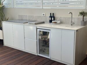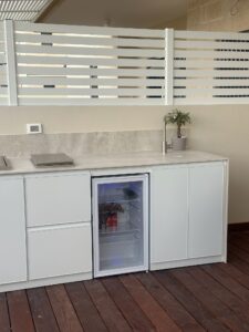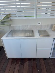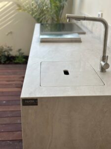 המשטח העליון מחופה שיש גרניט פורצלן יוקרתי, חזיתות המטבח חופו ב-HPL עמידים בגימור מושלם והמטבח כולו עוצב במראה נקי, מודרני ופרקטי במיוחד. למרות מגבלת הגודל, שילבנו מגוון רחב של אלמנטים חיוניים – גריל גז Drop-In עם 4 מבערים שקועים בגובה המשטח, כירת גז עם מבער בודד, מקרר, כיור וברז וכיסוי שיש בהתאמה מושלמת כדי להוסיף משטח עבודה.