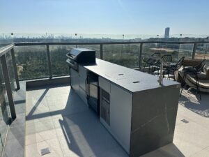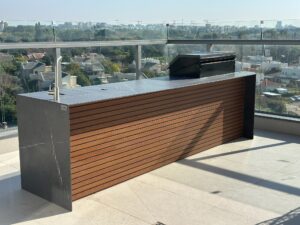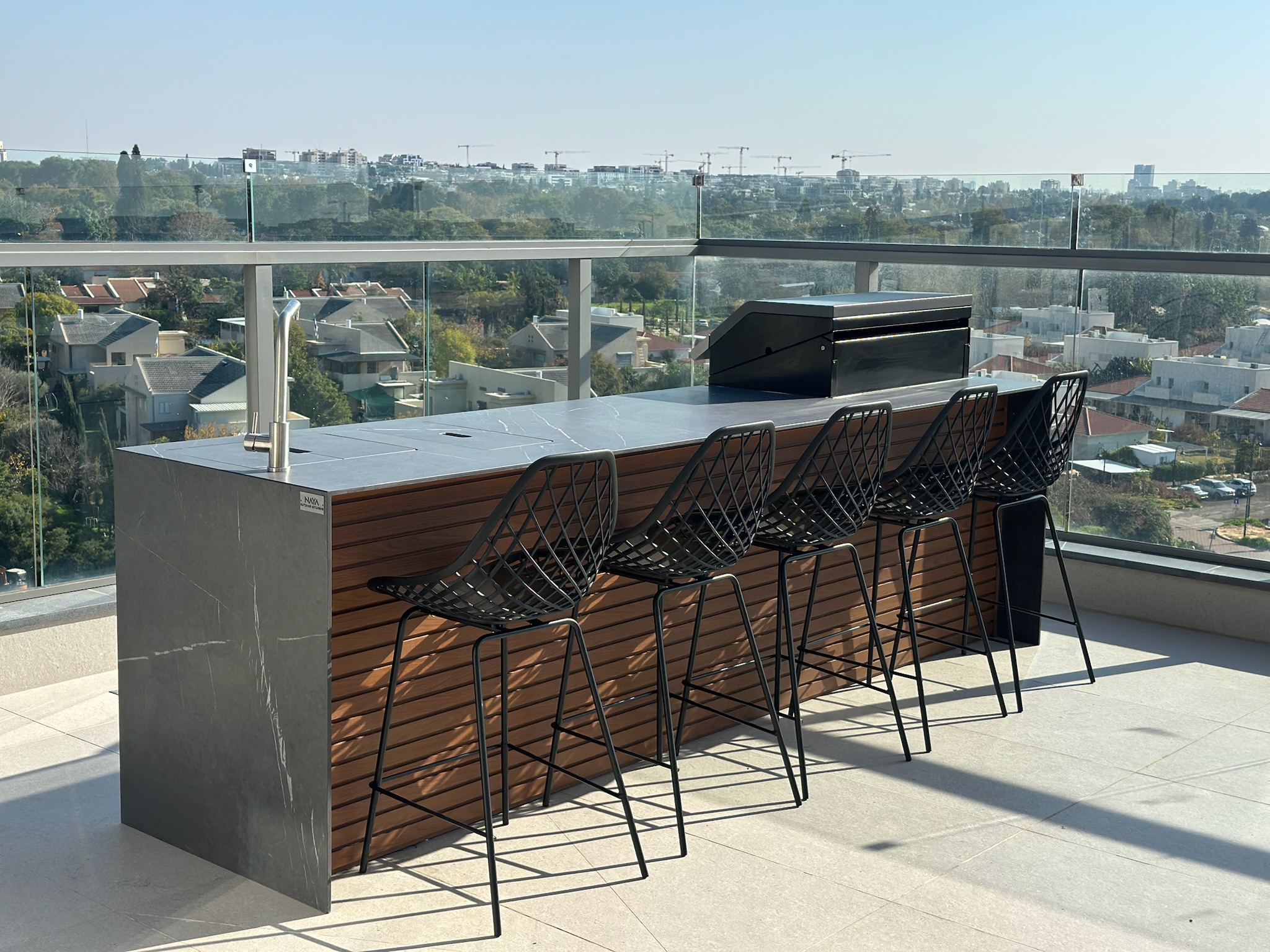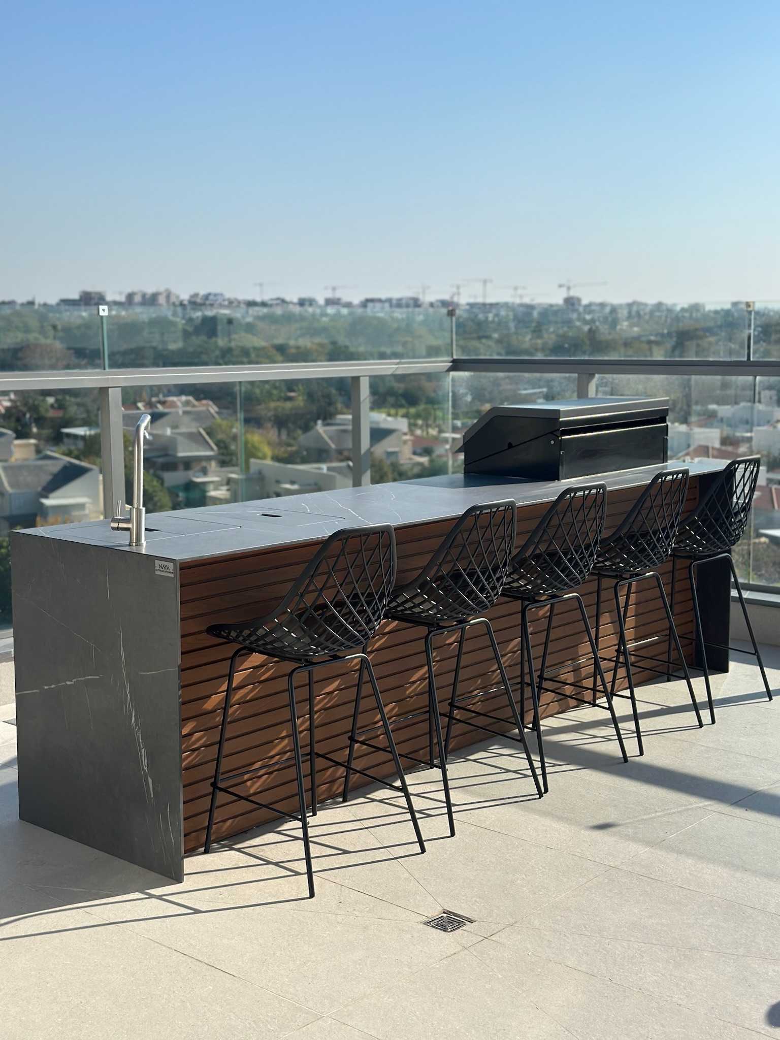 ברחוב שקט בהרצליה, יצרנו מטבח אירוח (בר) יוקרתי באורך 3 מטרים, המשלב באופן מושלם בין עיצוב מוקפד לפונקציונליות גבוהה. גוף המטבח עשוי אלומיניום איכותי ועמיד, עם משטח עליון משיש גרניט פורצלן – חומר שמשדר יוקרה ומתאים לשימוש חוץ לאורך זמן.