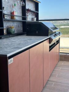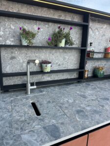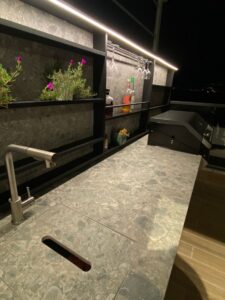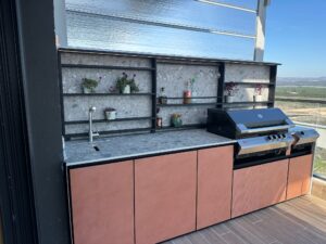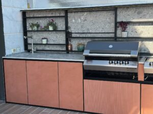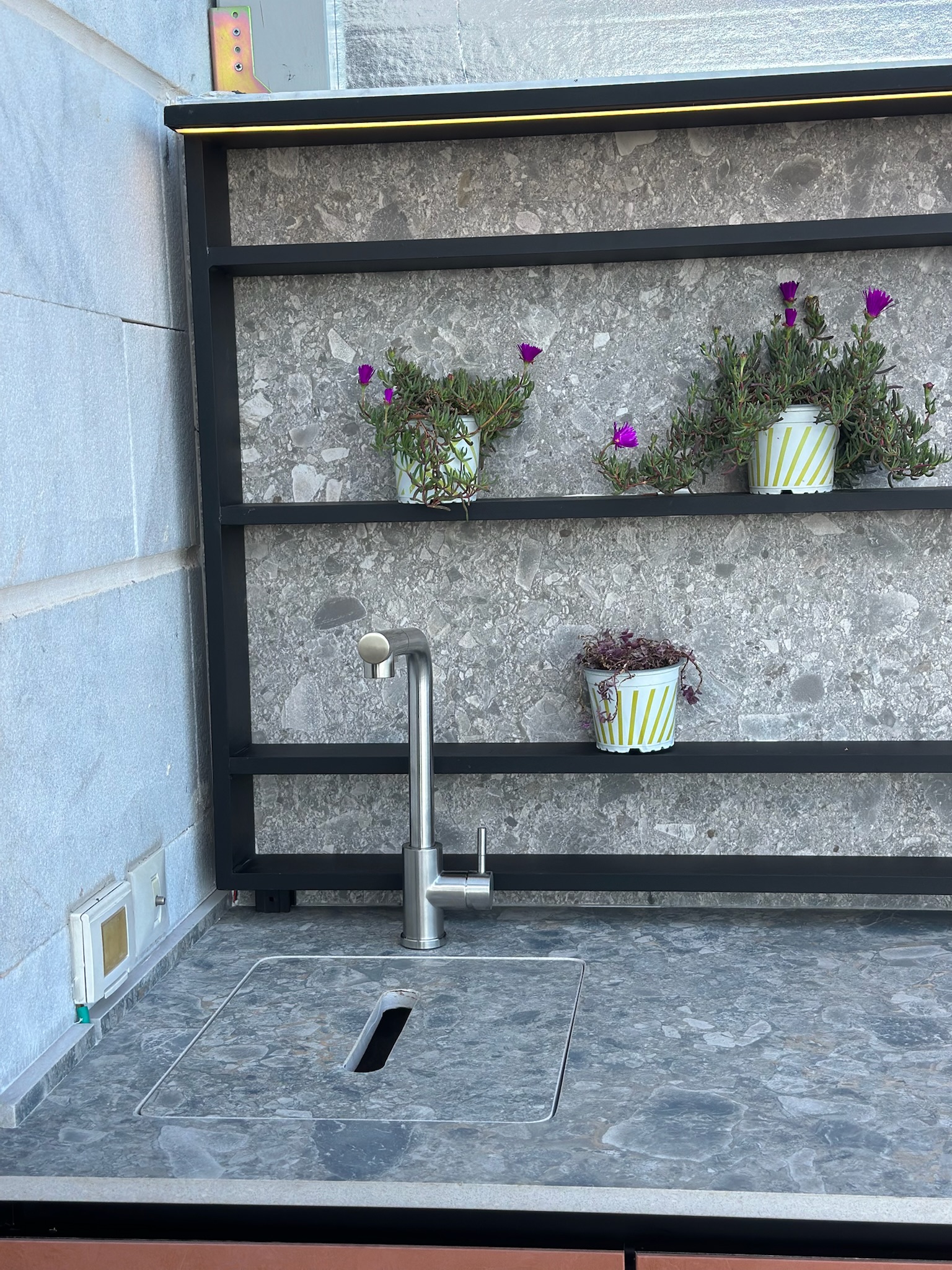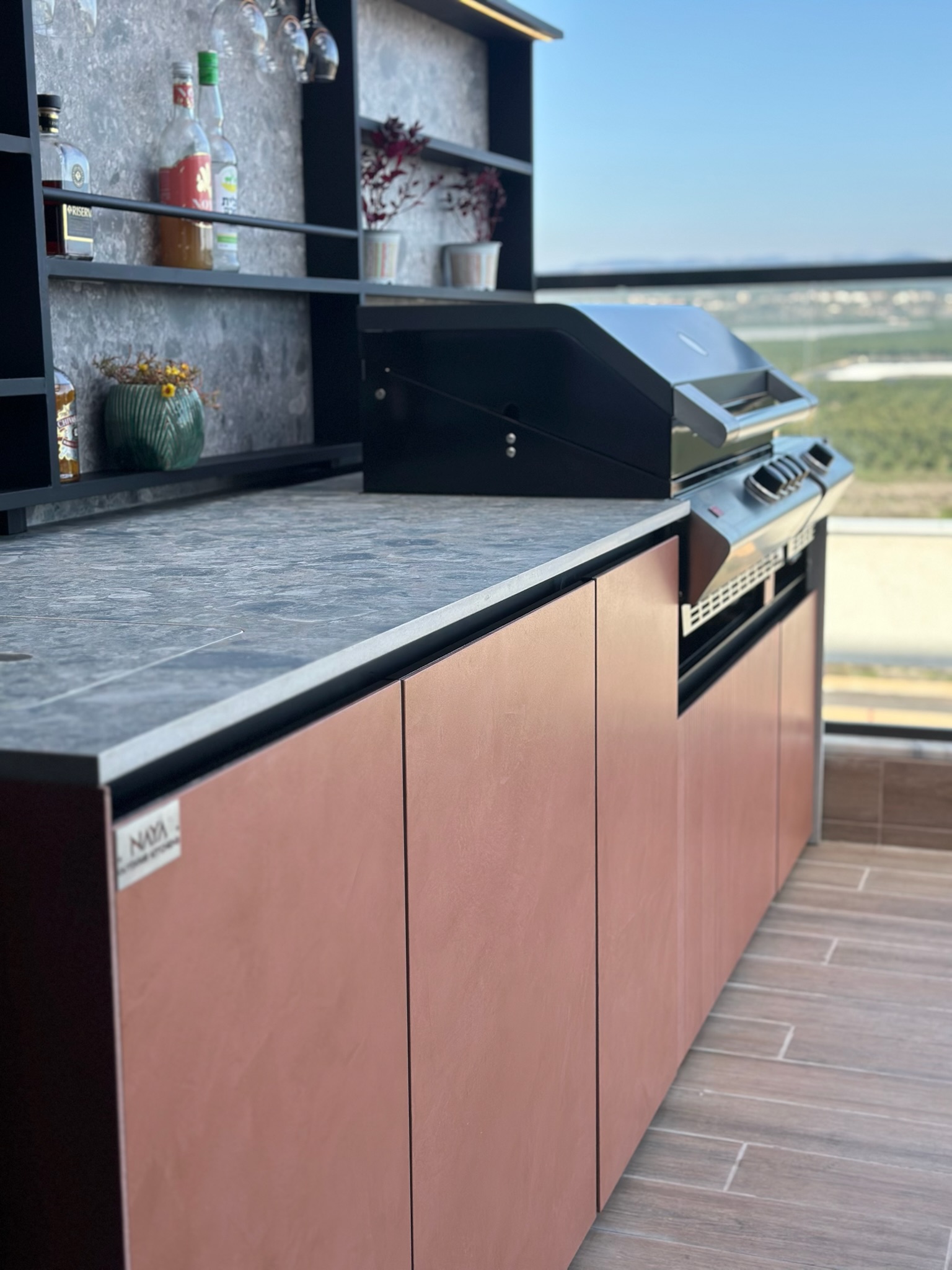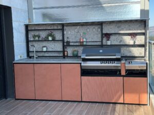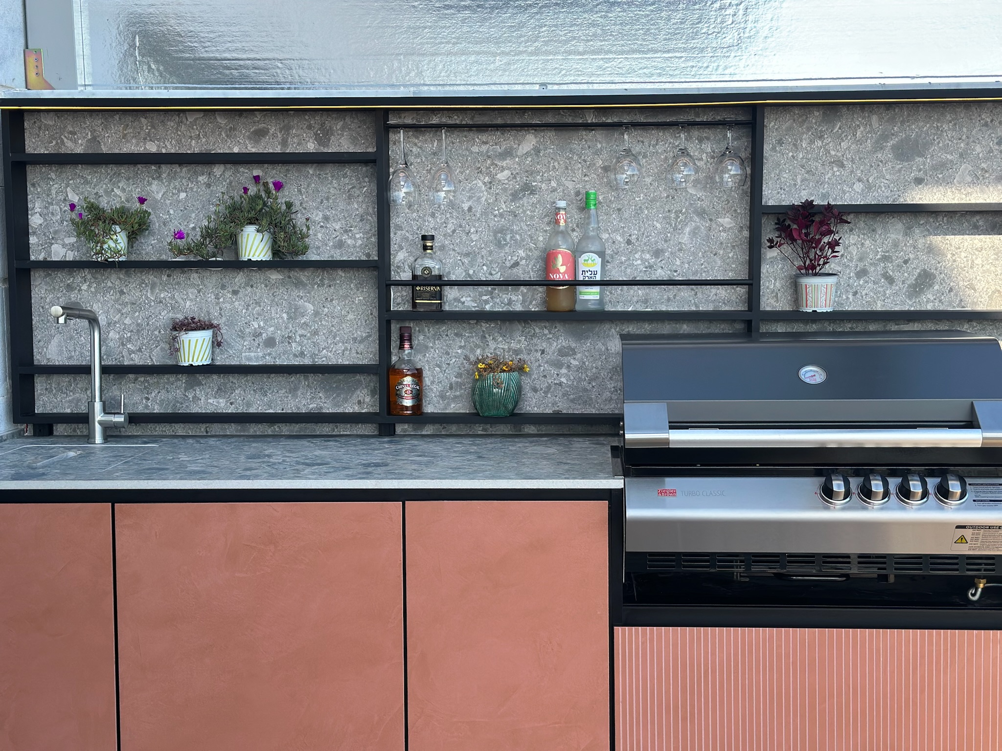 לצד זאת, שילבנו מדפי אלומיניום עמידים ואיכותיים על הקיר – פתרון שמשדר עיצוב מוקפד, שימושיות ותחושה של מרחב פתוח למרות המידות הקטנות. הפרויקט משדר מקצוענות וחדשנות, ומדגים איך ניתן להוציא מטבח חוץ מושלם גם במרחבים מוגבלים.
